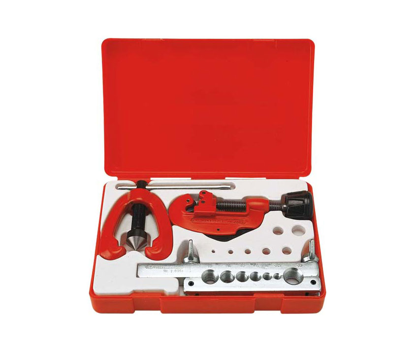 Для изготовления точных простых и двойных бортиков под 45° на медных, латунных, алюминиевых и тонкостенных стальных трубах диаметром 3/16 – 5/8". В комплекте с труборезом 725 и насадками для двойной развальцовки.